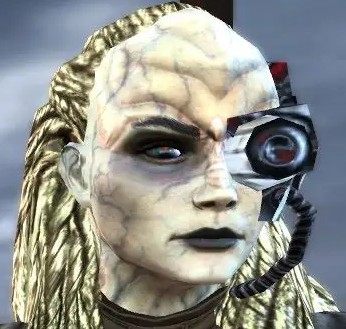 | Physical Description | Two of Eight is a Liberated Borg drone of Klingon origin; she has straw blonde hair and one green eye, the other was replaced by an ocular implant and eyepiece. |